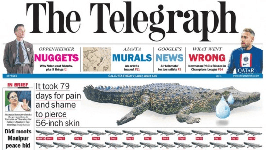 The Telegraph’ newspaper ridiculed Prime Minister Narendra Modi for breaking his silence after 79 days of riots in Manipur. The mockery featured an image of a crying crocodile on the entrance web page with the caption that it took 79 days for ache and disgrace to penetrate its 56-inch physique. In Manipur, from May 3, when the riots began, the crocodile didn’t shed tears for 78 days and the crocodile tears on the 79th day. Every day is given together with an image of a crocodile in every pot.