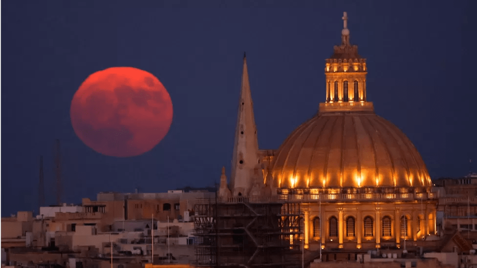 The supermoon rose behind the dome of the Basilica of Our Lady of Mount Carmel in Valletta, Malta