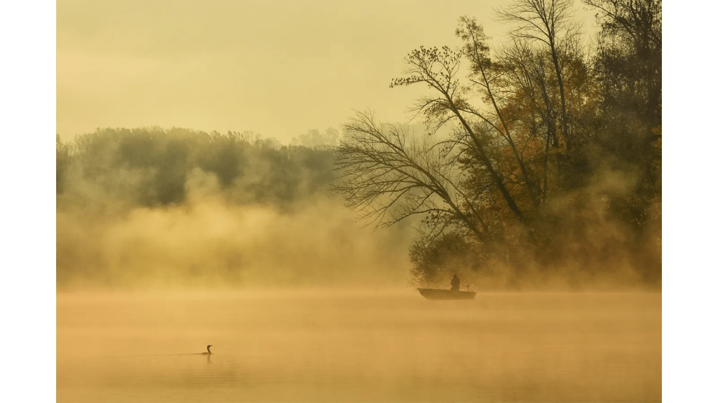 “Gold mist is suspended on the still lake surface, and amid this dreamy scene is the coexistence of a fisherman and a duck. Seeing this unlikely duo at Marsh Creek State Park, I knew that I had to capture the scene in a photo. (Credit: Lilly Zhang)