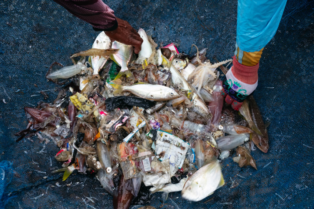 Fishermen separate fish from plastic waste collected in their nets. The separation of plastic and the sorting of the catch is an increasingly laborious task as the amount of waste increases.