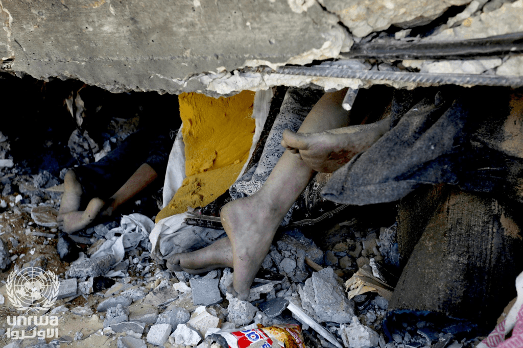 Palestinians under the rubble in 2023 after Israeli airstrike of homes in the Gaza Strip. (Ashraf Amra /United Nations Relief & Works Agency for Palestine Refugees in the Near East/ Wikimedia Commons /CC BY-SA 4.0)