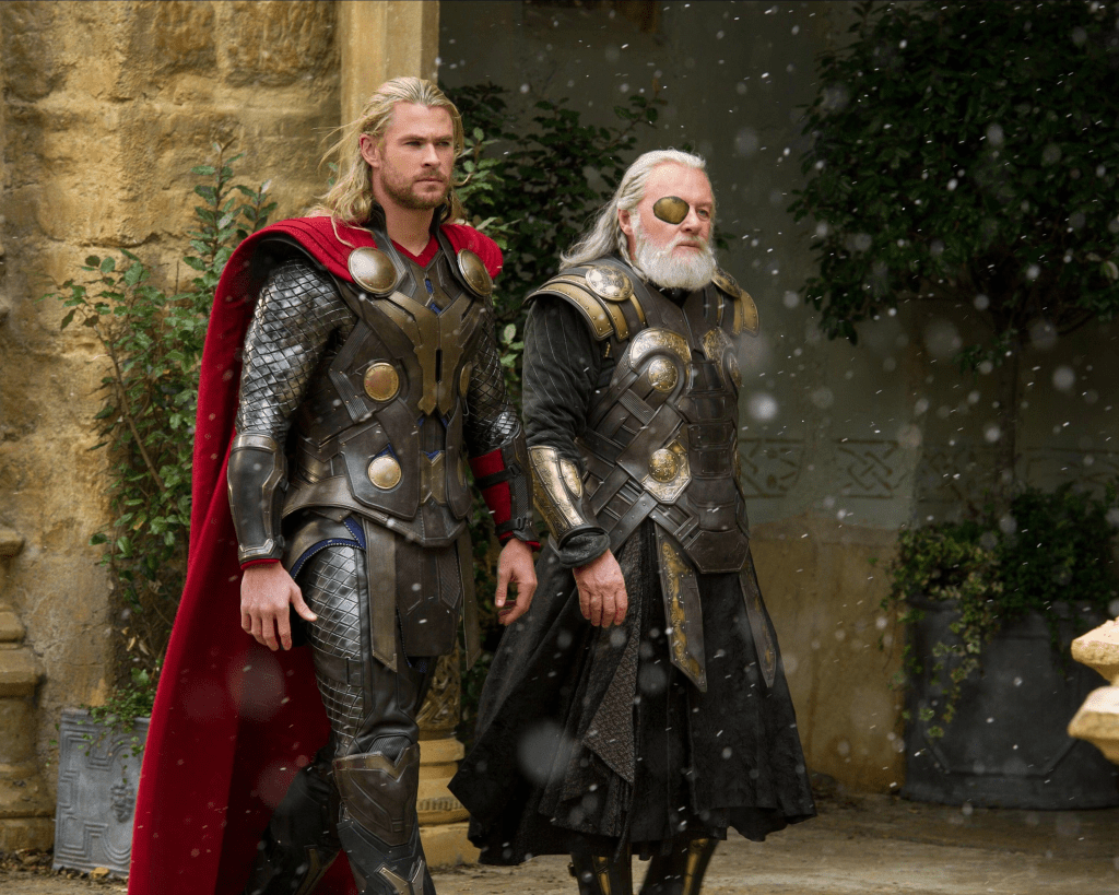 Hopkins as Odin alongside Chris Hemsworth as Thor in Thor: The Dark World. Photo: Cinematic/Alamy
