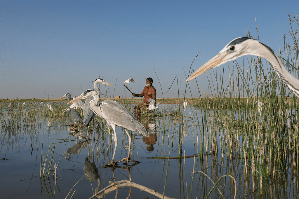 A Mohana hunter holds a thin branch with a living bird tethered to the end, which he uses as a decoy to trap wild birds